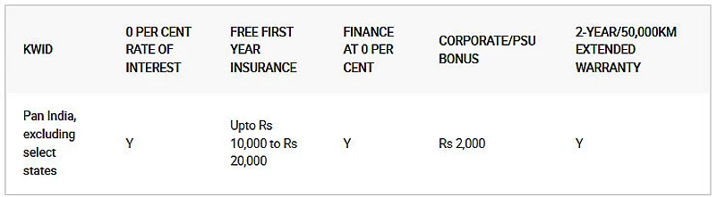 The offers on the Kwid are standard across India. However, residents of Jammu & Kashmir, Jharkhand, Mizoram, Manipur, Arunachal Pradesh, Bihar, Meghalaya, Nagaland, Sikkim, Asansol City can get an additional discount of Rs 6,500.