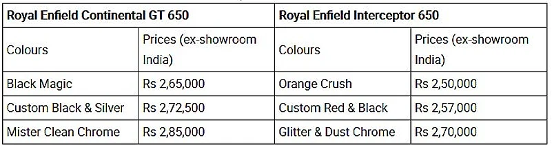 - Interceptor 650 and Continental GT 650 have been launched at Rs 2.50 lakh and 2.65 lakh (ex-showroom pan-India) respectively