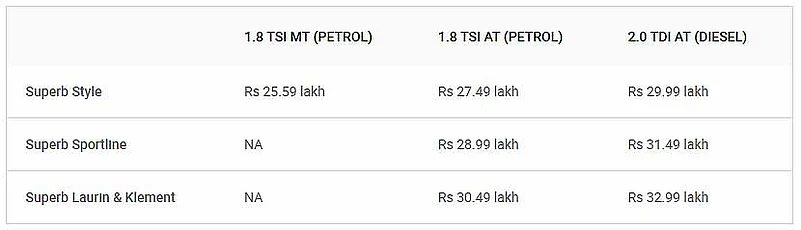 The petrol-powered version of the Superb Sportline is powered by a 1.8 TSI engine (with a 7-speed DSG) that puts out 180PS and 250Nm, while the diesel version gets a 2.0-litre TDI (with a 6-speed DSG) that generates 177PS and 350Nm.