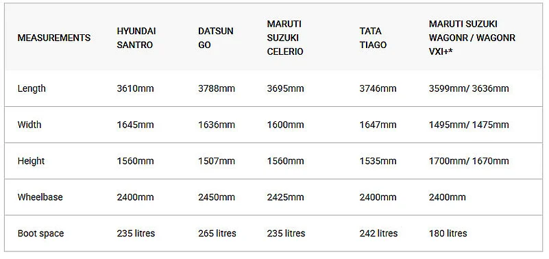 Hyundai has launched the new Santro in India. It rides on a new platform which Hyundai calls K1 and is not an entry-level Hyundai anymore. So, now it doesn’t compete with cars like the Alto, Kwid and redi-GO but rivals the likes of the Tata Tiago, Maruti Suzuki WagonR and Celerio and Datsun GO. With its launch, the competition in this segment has grown fiercer making it even more tough for buyers to zero-in on any one product. A spec comparison might not make you zero-in on the variant you should be buying, but it might help you to shortlist the car model that suits your needs. Let’s start by comparing the measurements.
