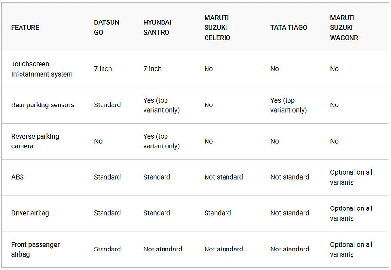 When it comes to comfort and other need-based features, the Santro takes the lead as it gets a 7-inch touchscreen infotainment system with Apple CarPlay and Android Auto, reverse parking camera and rear AC vents. The Datsun GO is also equipped with a 7-inch touchscreen infotainment system with Apple CarPlay and Android Auto but it misses out on reverse parking camera and rear AC vents. Other cars in this comparison also miss out on these features including a touchscreen infotainment system. Instead, they get a 2-din music system.