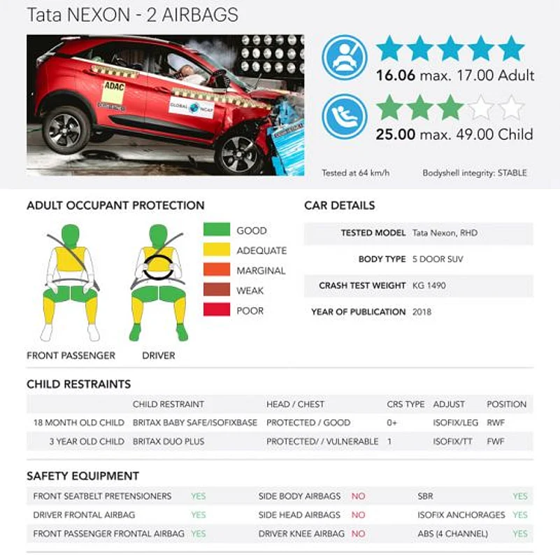 While the Tata Nexon is rated five star for adult occupants, it is also the safest when it comes to the safety of child occupants with a three-star rating. The Nexon scored an excellent (16.06/17) for adult safety and (25/49) for child occupant safety in the Global NCAP tests.