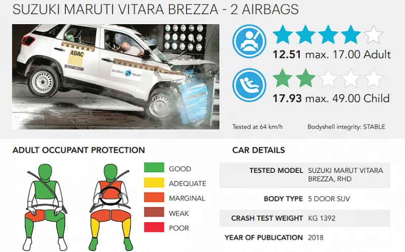 The overall score for the Vitara Brezza for adult occupants was (12.51/17). However, the Brezza leaves us wanting for more when it comes to child safety as the overall score stood at (17.93/49).