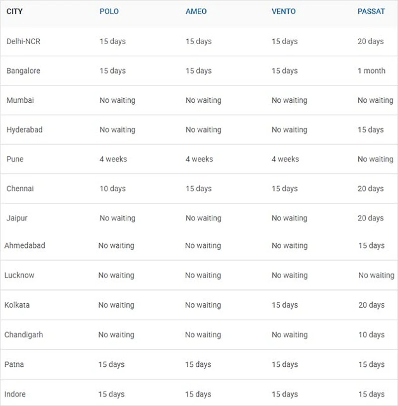 Planning to get a new Volkswagen car this Navratri? We have good news. Given you book it now, Volkswagen should be able to deliver any of its cars by Navratri. In fact, since the waiting period on most VW cars is less than 20 days in all cities apart from Pune (surprising, since VW manufactures its cars in Pune!), you can even wait for month-end deals, that VW might roll out, before signing the dotted line.