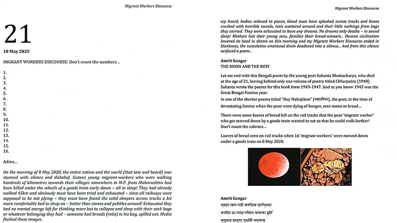 The ongoing Migrant Workers Discourse on my Facebook page was my response to the tragedy inviting reactions from my friends and foes, from the known and the unknown. To make the ‘memory’ enduring, I came upon the idea of juxtaposing actual images of migrant workers with some from our popular cinema. The country’s poorest were dying on rail tracks and roads, in homes and in hospitals, and we never knew their names, nor their numbers. But from my Facebook images, an e-book was taking shape, perhaps the first such book in the world emerging from a long Facebook post and the discourse around it.