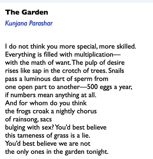 Parashar is a young poet, based in Mumbai – a subject that frequently sidles into the landscape of her “ecological” musings about the contemporary world. Her poetic practice, and attitude towards both the form, and its exponents, is an epitome of the curatorial intentionality of “small kindnesses” (with apologies to Danusha Laméris). In a very short time, she has garnered several accolades in the poetry world - her bio in The Adroit Journal reads: “Her manuscript They Gather Around Me, the Animals, selected by Diane Seuss, has won the 2024 Barbara Stevens Poetry Book Award. She has received the Toto Funds the Arts award and the Deepankar Khiwani Memorial Prize. She is an associate editor at The Bombay Literary Magazine.”