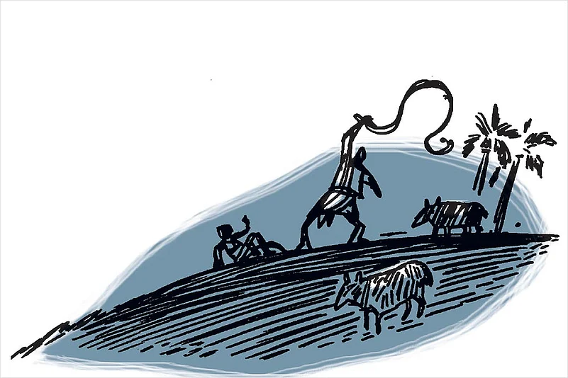 The sheep graze peacefully on both sides of the mudbank that leads to the lake. Along the water runs a line of tall dung weeds. The shoreline snakes on, calmly, effortlessly. The sheep will come down and graze along the shore soon. All is well here. He need not worry even if he has to go away for two days. Besides, Belly and Matchbox are there, and he can ask them to keep an eye on his sheep.