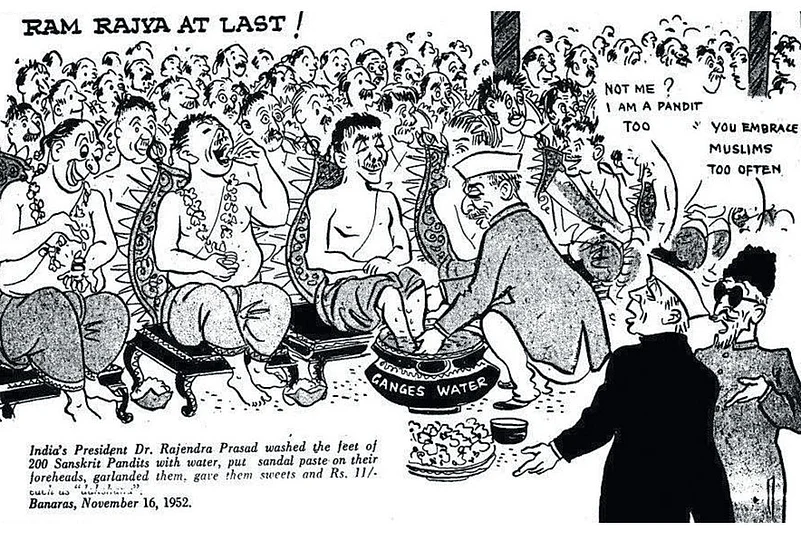 Rattu says the book was complete in all respects, but its publication was held up as Ambedkar wanted to add two important photographs. The first was of Dr Rajendra Prasad, the first president of the republic, visiting Benares in 1951, worshipping Brahmins, washing their feet and drinking the water. The second photo related to Nehru who on August 15, 1947, sat at the yagna performed by the Brahmins of Benares to celebrate the event of a Brahmin becoming the first prime minister of free and independent India. Nehru is said to have worn the Raja Danda given to him by Brahmins and drank the water of the Ganga brought by them. Rattu notes that while “Dr Rajendra Prasad’s photo had become available, search was on for the photo of Nehru.”