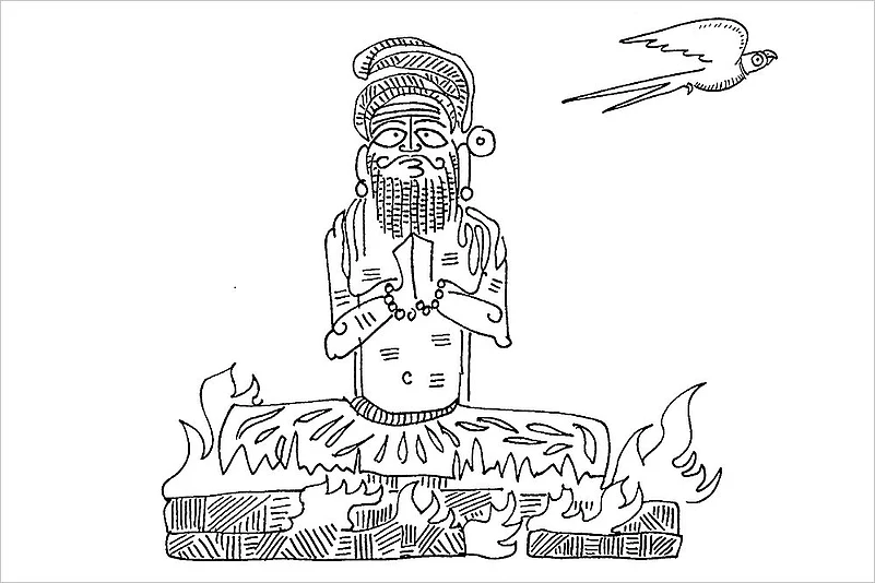 An illustration shows Raja Ratansen on the burning pyre; for Jayasi, sati is not the sole prerogative of women