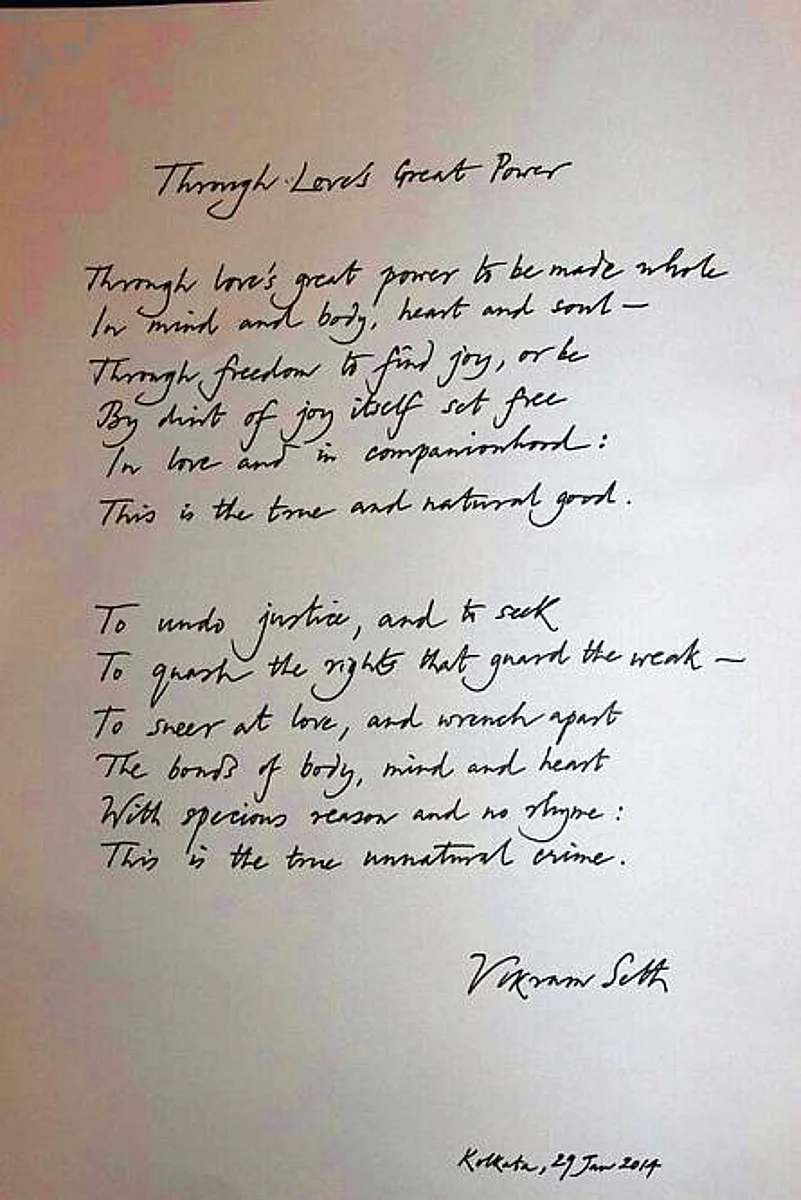 Yesterday, January 28, the Supreme Court refused to review its December, 2013 verdict criminalising gay sex. The court rejected the petition and said it found no merit in it. Author Vikram Seth, "restless, and unable to sleep", wrote the following in the hope that "maybe it will help give heart to some."