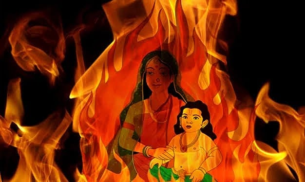 In a devious plan, Holika sat with Prahlad in a blazing fire, intending to burn him alive. As the fire roared, Holika sat on a pyre with Prahlad on her lap. But to everyone's astonishment, the opposite of what was expected happened. Due to her arrogance and misuse of her boon, Holika was consumed by the fire, while Prahlad, protected by his devotion and Lord Vishnu's grace, emerged unscathed.