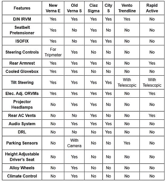 For the base variant of the 2017 Verna, let’s see where the new sedan stands against the base variants of its competition, and also against the model it replaces.