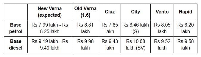 The old Verna’s base variant (known as Base) was available with the 1.4-litre engines only. It was priced at Rs 7.84 lakh for the petrol version and Rs 9.07 lakh for the diesel (both prices ex-showroom). The variant above the Base, the S, was equipped with the 1.6-litre petrol and diesel engines, and prices for this variant with the petrol and diesel engine were Rs 8.81 lakh and Rs 9.98 lakh (both ex-showroom), respectively.