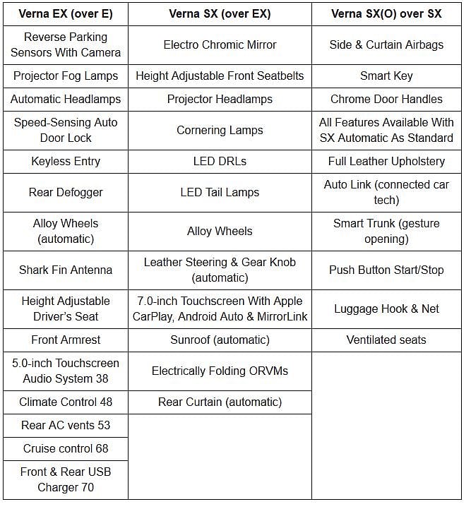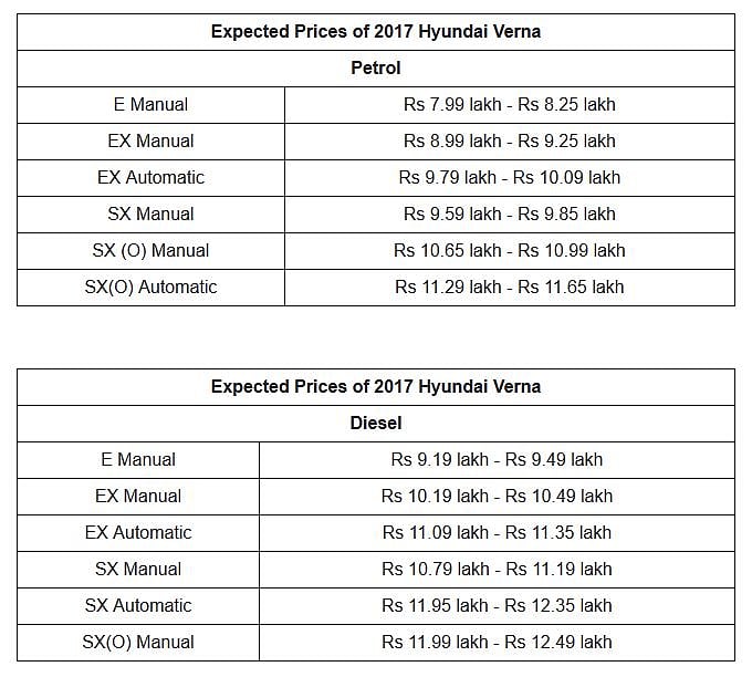 The expected prices of the remaining variants of the 2017 Verna purely on the basis of the additional features they offer over the lesser equipped variants are:
