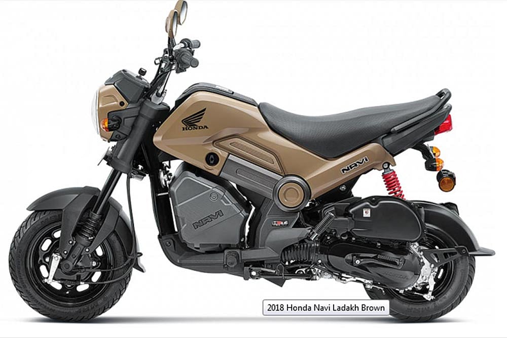Honda India has launched the 2018 Navi in the country at Rs 44,775 (ex-showroom Delhi). For 2018, the Navi comes with a much-needed analogue fuel gauge for its tiny 3.5-litre fuel tank. Other additions include a metal exhaust heat shield, new body-coloured grab rail, headlight cover and rear view mirrors. The 2018 model also features a red finish on the rear springs. Two new colours, Ranger Green and Ladakh Brown, add to the already existing Patriot Red, Shasta White, Sparky Orange, and Black.