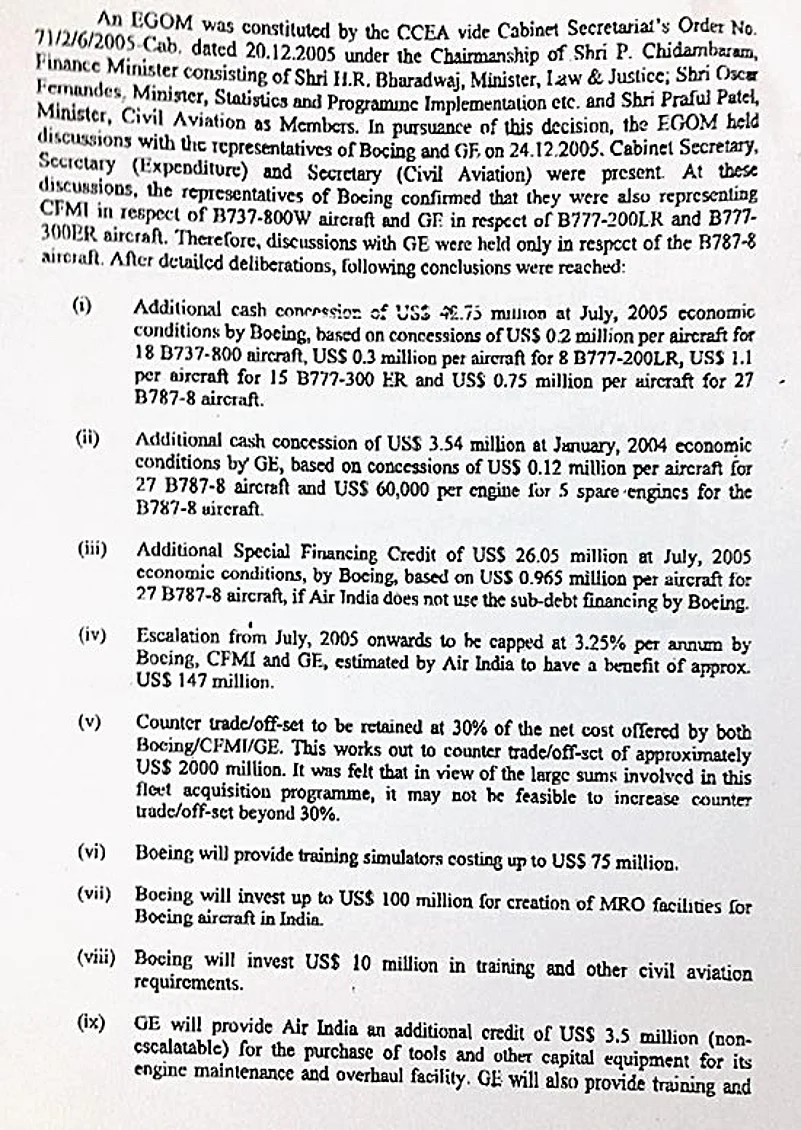 “They were all major decisions, consciously taken. The purchase order was cleared by an empowered group of ministers headed by P. Chidambaram and approved by Pranab Mukherjee, and ratified by the cabinet. A sovereign guarantee had to be given by the government for purchase of the aircraft. Not a single decision was mine alone. The decision does not even have my signature. It was signed by Chidambaram,” he says.