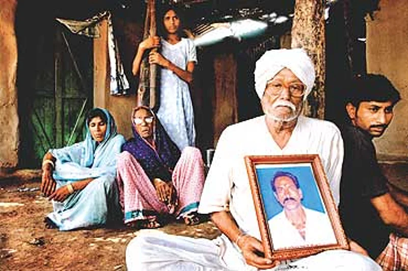 Surrounded by other neighbours—all widows—P. Sunitha of Nalgonda, Andhra Pradesh, braves the blistering May heat to sit on dharna with her two-year-old son, clutching a photograph of her husband Rangaya hanging from the rafters of their hut. In the past few years, over 4,000 farmers, many from the cotton and dryland belt of Andhra, Maharashtra, parts of Kerala and Punjab, have killed themselves, trapped in a vicious cycle of debt, crop failure, penury and extreme hopelessness.