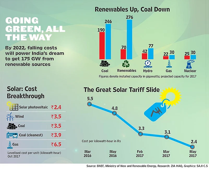 The targets achievable by 2022—the next five years—include 175 GW from renewables. Of this, 100 GW will come from solar, 60 GW from wind, 10 GW from biofuels and 5 GW from small hydropower. All this will feed into one larger target: 40 per cent of India’s energy requirements will come from non-fossil fuels by 2030. That’s so ambitious that some scepticism is legitimate.