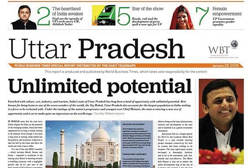 The World Business Times, the business supplement of the UK-based Daily Telegraph, has come out with an eight-page pullout on India’s most populous state, claiming “sole responsibility for the content”. There are 18 stories in all, with nine international bylines (from Paul McNamara to Timothy Walters). With headlines like ‘Unlimited Potential’ and ‘The Rise of Female Empowerment’, the package covers it all—politics, business and soft power. Here’s one telling sample: “It would seem the young leader has perfected the art of managing multiple hats as a CM, party leader, husband, father, son, and friend.”