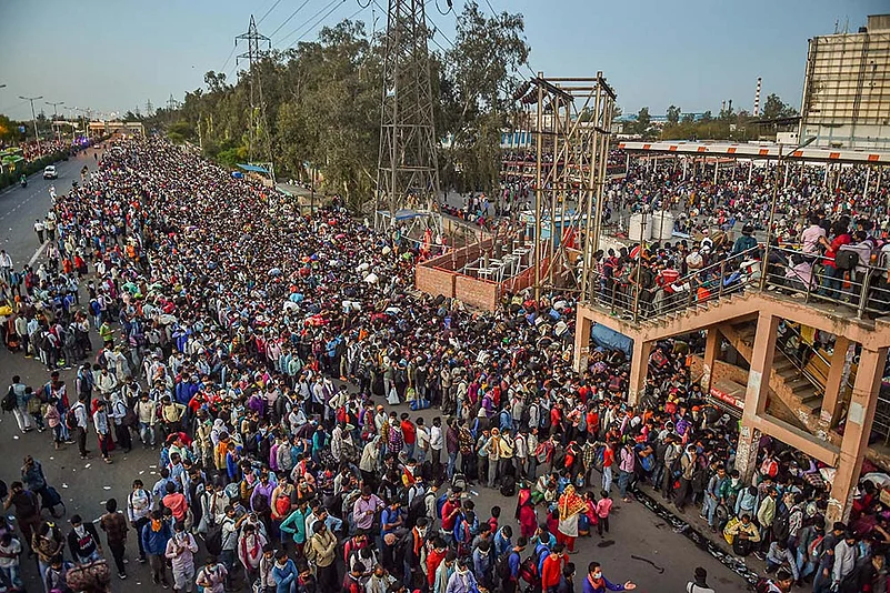 Hundreds of migrant workers—jobless, homeless and almost without cash and food—gathered outside a Bandra railway station in Mumbai following rumours that train services would resume on April 15.
