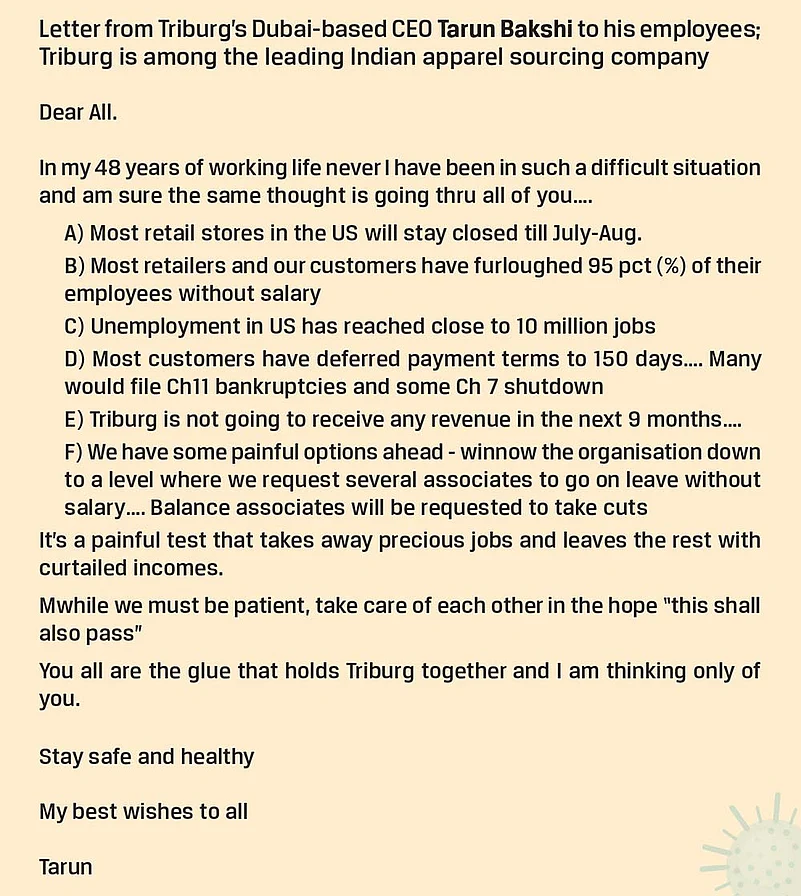From end-March, most companies have resorted to one of these three decisions—sacking people, asking employees to go on indefinite leave without pay, and slashing salaries by as much as 85 per cent. Emotional and distressing emails about jobs and wage cuts were dispatched from their corner rooms by CEOs to employees, some of whom had worked in the same companies for decades. The Dubai-based CEO of Triburg, an apparel-sourcing firm, wrote, “In my 48 years of working life, I have never seen such a difficult situation....”