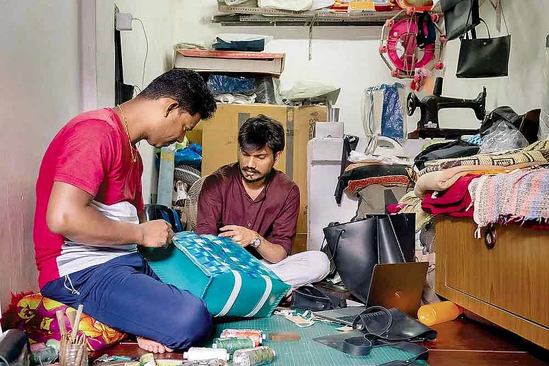 Sunil Netke, a Dalit craftsman who has a 250-sqft workshop in Dharavi, became associated with the studio two years ago. The 64-year-old makes leather bags. “I learnt the art of making bags and belts from my father, Shahdev Netke. He has been in the business for the past 40 years—he shifted to Dharavi in 1974, when he was hardly 10-12 years old,” says Netke.