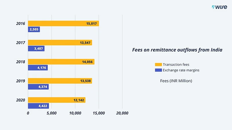 Consumers sending money into India from abroad are not spared from hidden fees. Over the past five years, money lost to exchange rate margins on inward remittances have grown from Rs 42 billion to Rs 79 billion. Meanwhile, fees paid to transaction costs have grown from Rs 102 billion in 2016 to Rs 140 billion in 2020.
