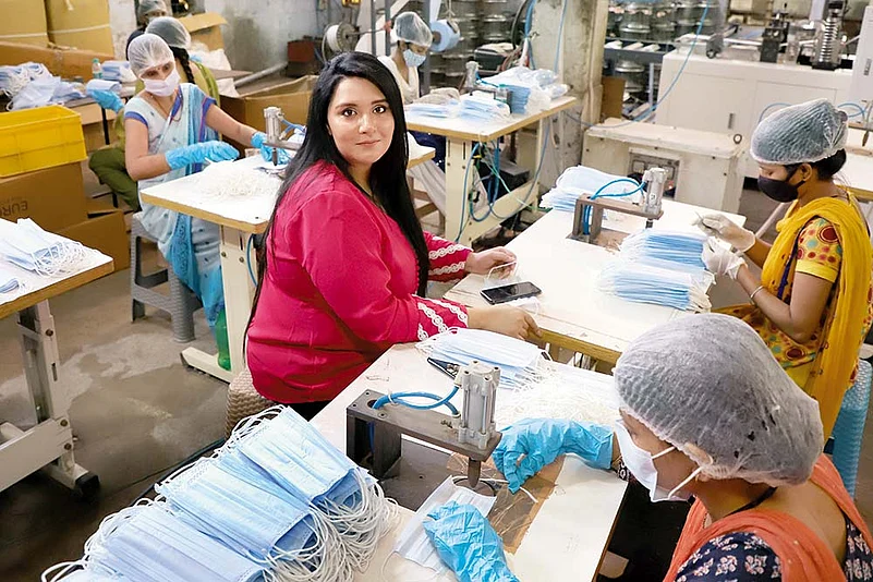 Neha Chopra at her mask-manufacturing unit in Delhi.