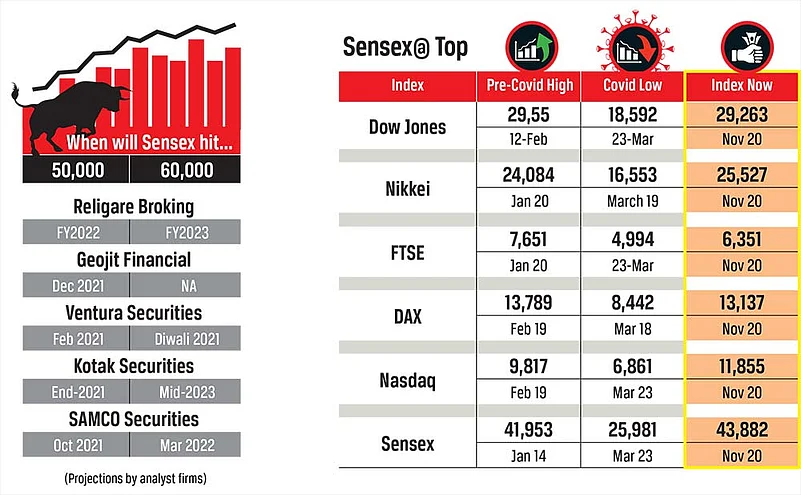 But the fireworks were set off alright—the bull took off in a frenzy, kicking and stomping India’s stock markets into life after months of lethargy brought by the Covid pandemic that has blighted the global economy. Since Diwali, the BSE index, Sensex, has continued its consistent, and unprecedented, northward march. As have the rest of the exchange’s 50-odd indices, which are related to specific sectors and stocks. Despite the viral uncertainty, the stock market rise has set the hearts of the Indian investors ablaze with optimism.
