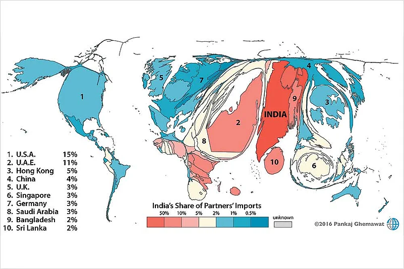 The map shows the destinations of India’s exports. One immediate inference is the tendency to export more to countries where there is a large population of Indians and people of Indian origin. While it is true that the U.S. is both the largest country in the world in terms of GDP and India’s largest export destination, the United Arab Emirates, which has less than half a per cent of world GDP but more Indians than any other foreign country, is the second largest destination. Germany is the largest European economy, yet India exports more to Britain.