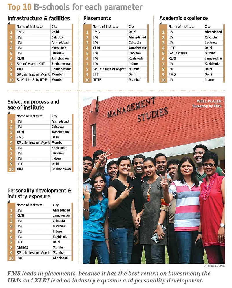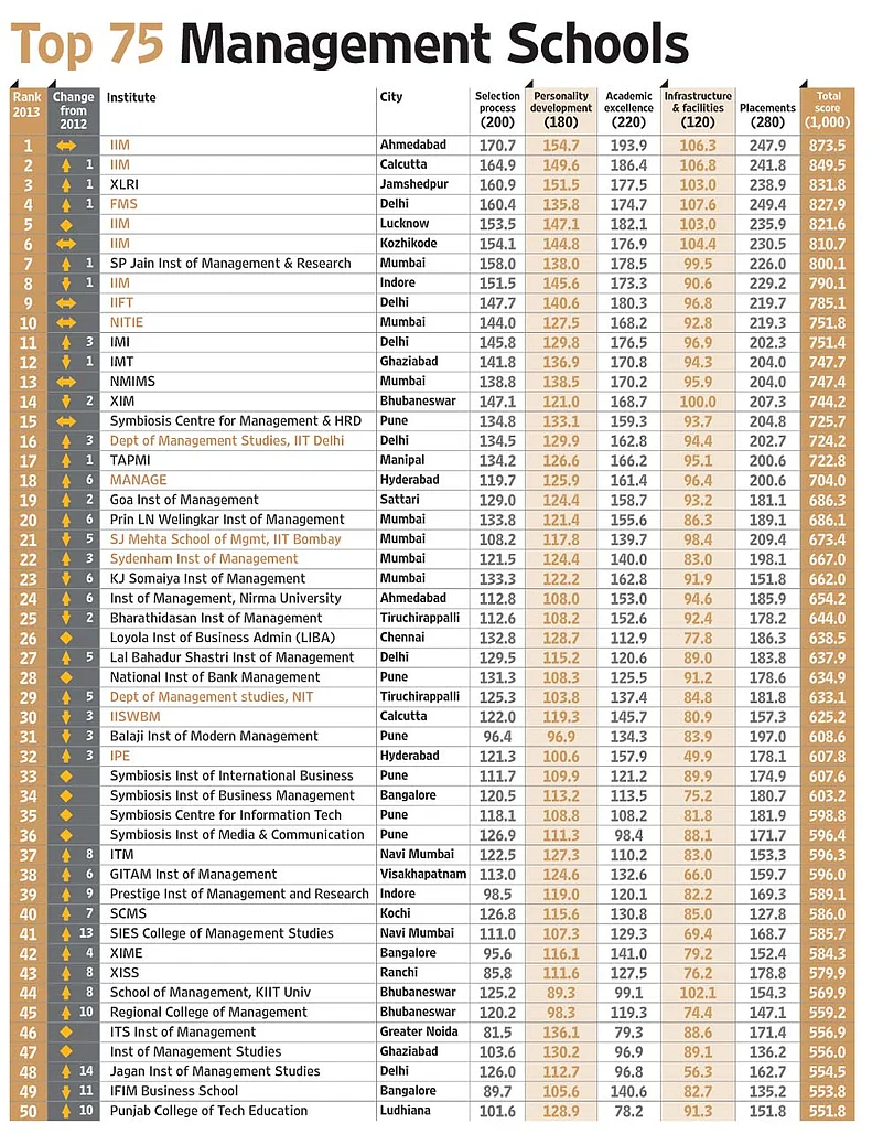 - Only B-schools which sent objective data have been ranked. Institutes like IIM Bangalore; MNNIT, Allahabad; Fore School of Management; IFMR, Chennai; IIT Madras; IRMA did not participate while NIILM; MDI, Gurgaon; FMS, Varanasi; NIAM; IRM, Jaipur; Anna University and Amity Business School did not send data within the stipulated time and have not been ranked