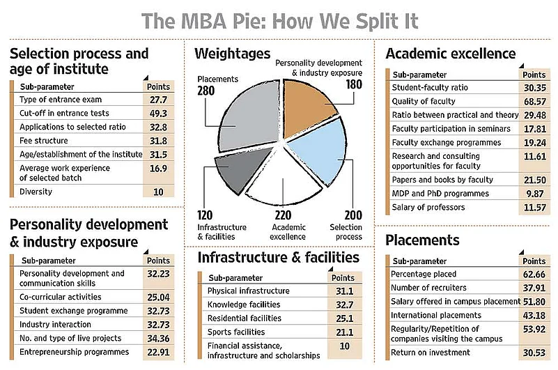 In order to rank India’s best B-schools, Drshti Strategic Research Services (Drshti) designed a detailed, rigorous methodology involving all the stakeholders—B-schools, recruiters, faculty and students. First, a comprehensive list of B-schools was drawn up. B-schools which offer two-year full- time management courses and are recognised by a government body such as the AICTE, NAAC and AIU, are at least five years old and have had at least three batches that have passed out qualified to be ranked. The list of parameters and sub-parameters was kept the same as last year’s to have consistency and comparability, except for an increased emphasis on diversity, which seems to be gaining importance amongst recruiters. There were 135 colleges across India which provided their objective data. Data from seven colleges came too late and has not been included; 16 others were unable to submit their data within the stipulated deadline and hence were not considered for ranking. This year, 49 new institutes participated.