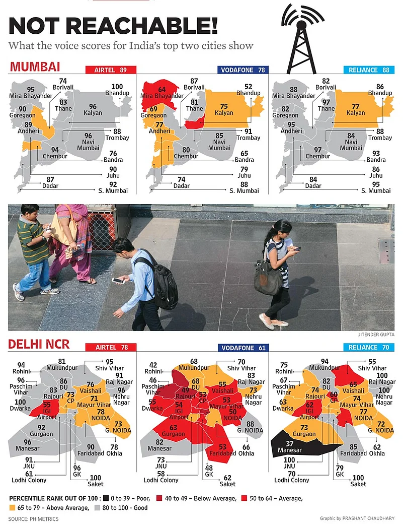 Reality: The TRAI benchmark for call-drop rates is 2 per cent or less. Internal audit data for Delhi alone (Jan-March) indicates rates of 6 per cent for Airtel, 9 per cent for Reliance and 15 per cent for Vodafone.