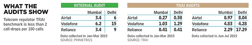 Despite such damning internal audit data, TRAI has been passing operators with flying colours for the past five years in its quarterly audits, with the major telcos in Delhi and Mumbai scoring either zero per cent or well below the 2 per cent benchmark. The call-drop graphs, says TRAI, rose after March but only slightly. Its report for Jan-Mar, in Mumbai, gave the following rates. Airtel: 0.27 per cent; Reliance: 0.41 per cent; and Vodafone: 1.03 per cent. In Delhi, the call-drop rates were: Vodafone 1.29 per cent; Airtel 0.58 per cent; Reliance: again 0.41 per cent.
