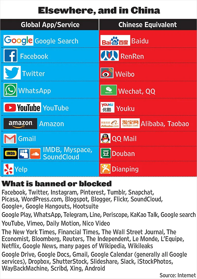 Yet there is one thing particularly interesting: the ban on these popular websites and apps has allowed Chinese websites and apps to thrive in the country. Local people widely use them. Interestingly, every global app or service has a popular Chinese equivalent. China has successfully developed its own ecosystem featuring websites, social networks and apps that are counterparts of popular global web services. The country has its own alternatives to Google, Facebook, Twitter, YouTube and e-commerce websites. China’s Twitter equivalent is an app called Weibo, it has Baidu that is the equivalent to Google search, Wechat, which is a messenger service, and Youku, which is a video-hosting service much like YouTube.