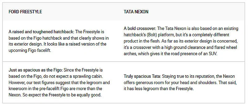 Ford calls its upcoming Figo-based crossover -- which takes on the likes of the Hyundai i20 Active, Toyota Etios Cross and the Fiat Urban Cross -- a CUV (compact utility vehicle). However, the Freestyle’s expected price tag also puts it up against some compact SUVs as well. That’s why we are pitting it against the most value-for-money sub-4-metre SUV, the Tata Nexon.