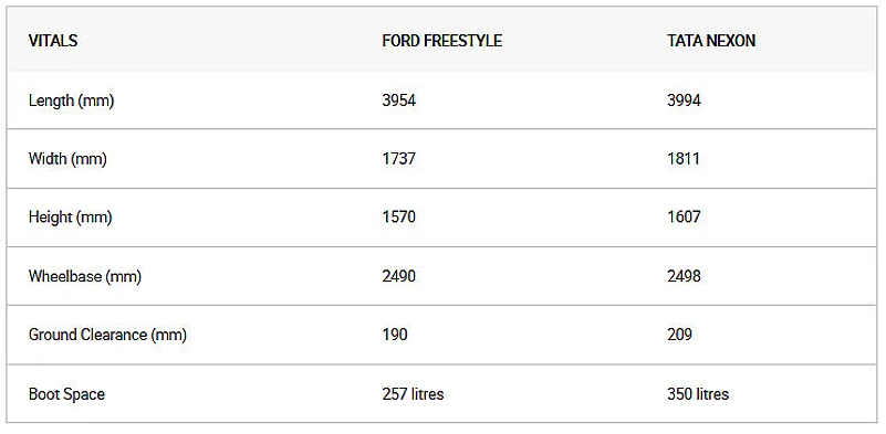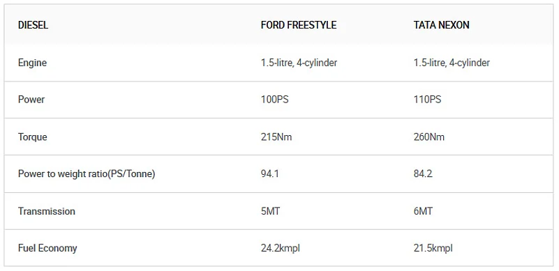 Going by the numbers above, the Freestyle may appear to be no match to the Nexon. And that's because it really isn't, since the two cars belong to different segments. That said, the Freestyle’s relatively smaller dimensions will make it more suitable for those looking for a personal vehicle with limited parking space. Let us move to engine specifications now.