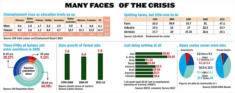 A fiery debate had flared up last year when the then chief of Niti Aayog, Arvind Panagariya, had hinted that there could be more jobs in the formal sector than is made out to be. Firms could be providing misleading staff strength to avoid paying social security. That’s likely to be true. When the government declared an amnesty scheme (in force between January to June 2017) for employers not declaring their actual staff strength in formal jobs—defined as those with social security and legal annual contracts—the enrollment in Employees Provident Fund jumped 26 per cent. That’s 10.13 million new employees enrolled in the Provident Fund Scheme. Although this is not new job creation (existing jobs were officially declared by firms), it does point to lack of reliable data on formal jobs, which could be more than current figures suggest. “Employment can only improve if the government can solve the non-performing assets problem along with debt-ridden firms. That’s the bottom line,” says Sonal Varma, an economist at Nomura.