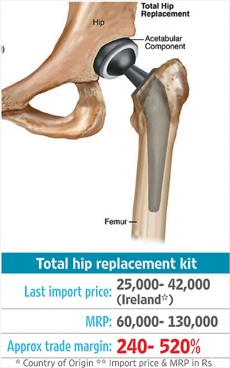 “The cost of a procedure in India is equal to the cost of a car, which is not the case anywhere else in the world,” says Varun Khanna, managing director of the Indian arm of Becton Dickinson, a leading US medical devices company with operations in Haryana. The statement is no exaggeration: patients have to pay exorbitant charges not just for hospital services and facilities, but also medical devices, like hip and knee replacement kits and all implants, most of which are priced 300 per cent to over 1,000 per cent more than the factory gate or import price.