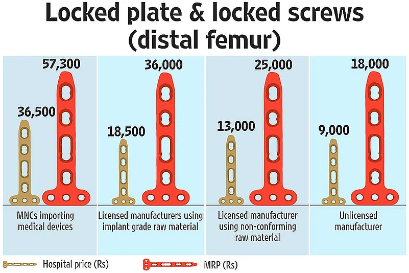A clear evidence of the wide margins came to the fore in February, when the National Pharmaceutical Pricing Authority (NPPA) gathered information on the prices of cardiac stents, before slashing the MRP by over 75 per cent. The scenario in cardiac care, of course, is only a small screenshot of a much wider reality operating on the same principle. Data compiled by Outlook reveals (see graphics) that in the case of a knee replacement kit (comprising a femoral component, a tibia component and a patella component, besides screws) the MRP fixed by the MNCs is 900 per cent to 1,000 per cent more than the landed cost (the price of an imported product that includes all charges and duties). According to shipment data provided by Bangalore-based Zauba.com (which tracks global trade on basis of bills of shipment), the last landed cost of a knee replacement kit was just Rs 10,159. The MRP was, however, between Rs 95,478 to Rs 1,47, 628, according to suppliers’ bills to hospitals accessed by Outlook. The story is much the same, whether it is hip replacement kit or heart valves, one of the most expensive among imported devices.
