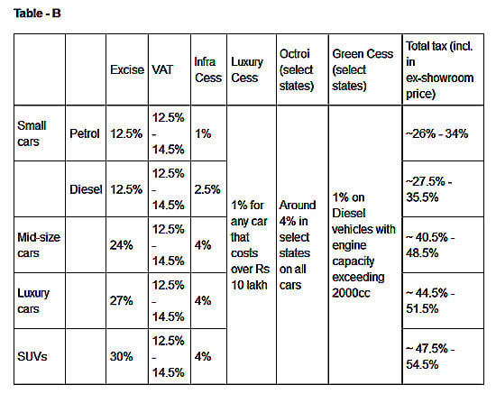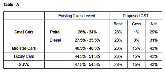 Before we take an example of a car; going by Table A, it is clear that in the case of small cars (both petrol and diesel) GST will end up increasing prices. However, that may not hold true for all those states that charge Octroi, for example, Maharashtra.