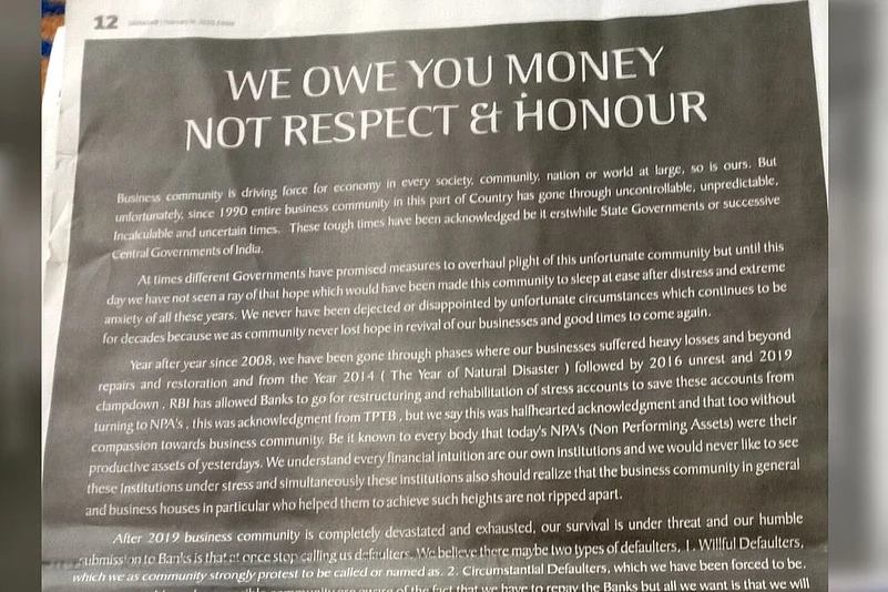 Several newspapers in Kashmir on Friday published a full-page advertisement with a bold heading: “We owe you money, not respect and honour.” The unusual advertisement was published on behalf of 22 Kashmiri trade bodies who allege they are being threatened by banks and called 'defaulters'.