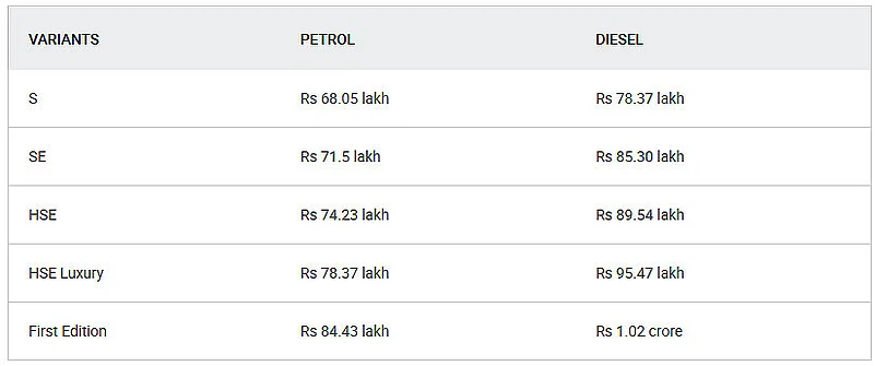 The Land Rover Discovery is available in five variants – S, SE, HSE, HSE Luxury and First Edition –, with each one offering the option of a petrol or a diesel engine. JLR’s recently introduced five years schedule maintenance plan can be availed at half the price for the new Discovery. Here are the prices (ex-showroom pan-India) for the all-new Land Rover Discovery.