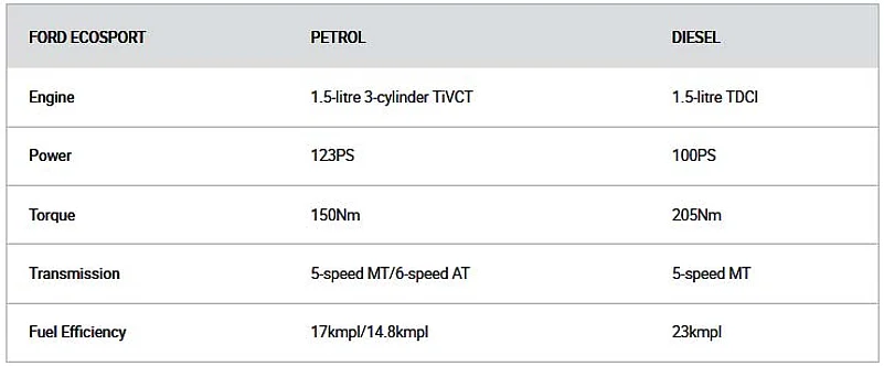 Mechanically, the updated EcoSport has received a brand new naturally aspirated 1.5-litre 3-cylinder petrol engine, which has single-handedly replaced the 1.5-litre 4-cylinder petrol unit and the turbocharged 3-cylinder 1.0-litre EcoBoost petrol engine. Ford has also replaced the 6-speed dual-clutch auto, which was available with the previous 1.5-litre petrol, with a new 6-speed automatic transmission. The 1.5-litre diesel remains the same and like before, comes mated to a 5-speed manual.