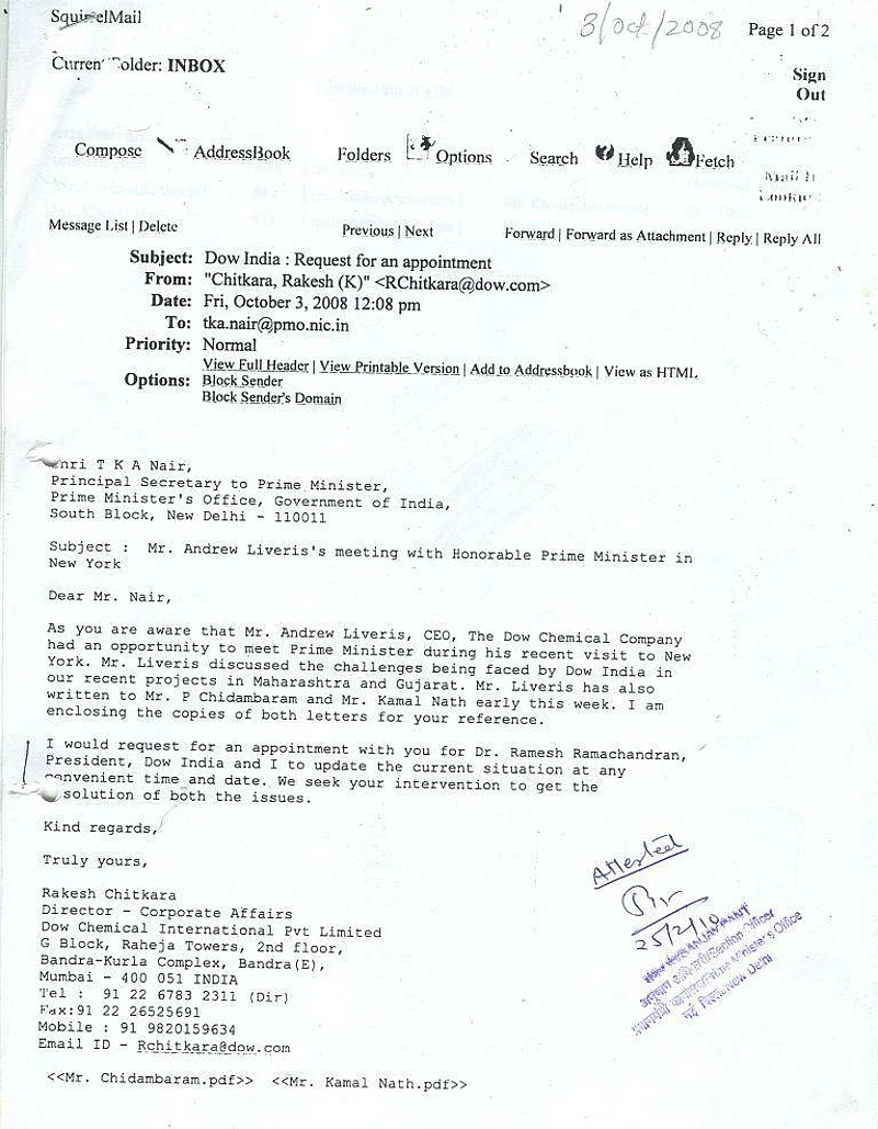 Letter from Dow India to PM's principal secretary TKA Nair: