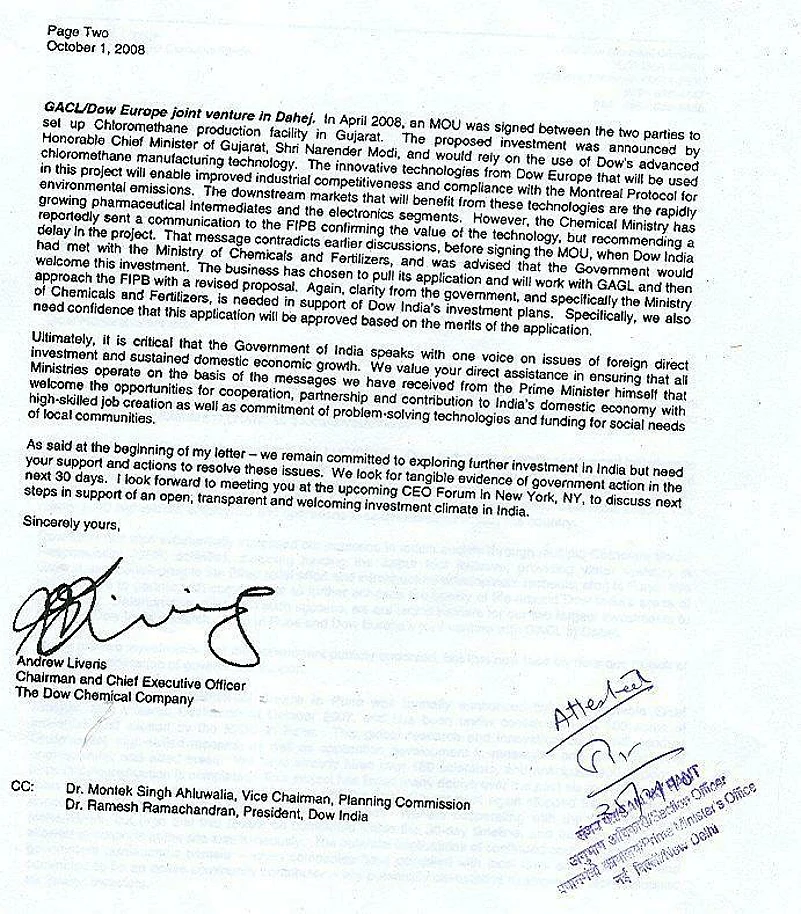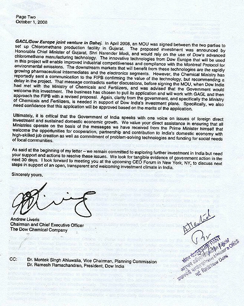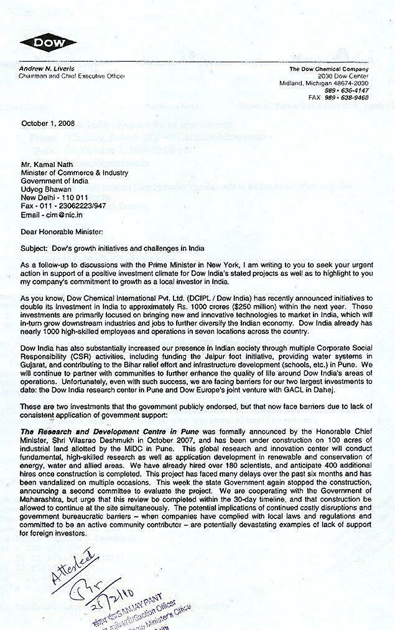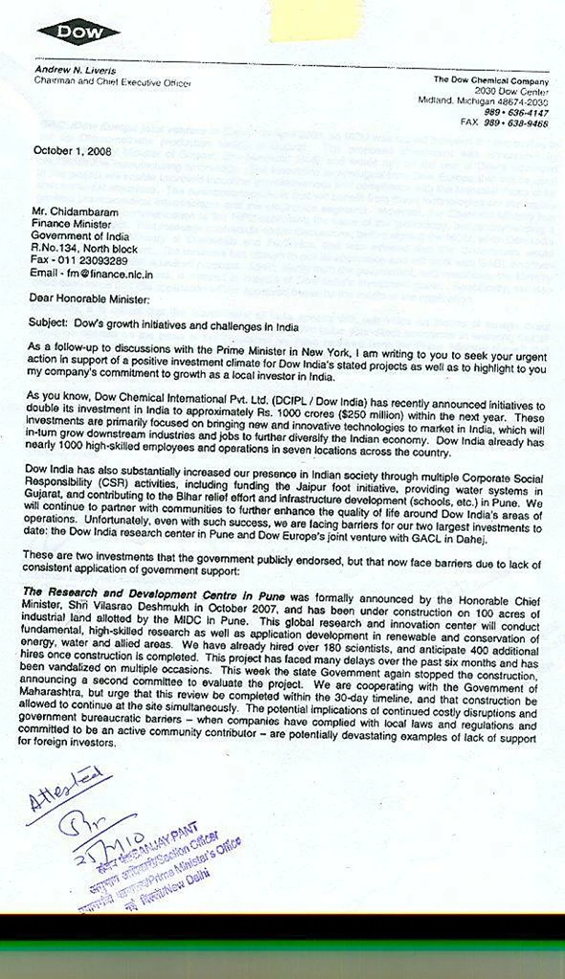 The letters that Dow CEO Andrew Liveris wrote to P. Chidambaram and Kamal Nath in October 2008, complaining about Chemical Ministry "recommending a delay" in Dow's projects and how it contradicts the "earlier discussions, before signing rgw MOU, when Dow India had met with the Ministry of Chemicals and Fertilizers, and was advised that the government would welcome this investment" and how "it is critical that the Government of India speaks with one voice on issues of foreign direct investment and sustained domestic economic growth."