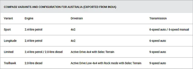 The variants and drivetrain options on the Compass for the Australian market are as follows: