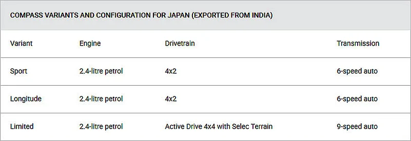 The variants and drivetrain options on the Compass for the Japanese market are as follows: