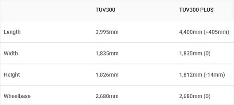 The Scorpio and the NuvoSport are also underpinned by the same. Here’s how the Mahindra TUV300 and the TUV300 Plus stack up against each other dimensionally: