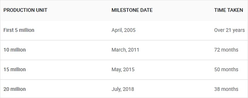 Maruti Suzuki had achieved the 1 million production in March 1994, nearly after a decade after start of manufacturing cars. The 5 million milestone was achieved in April 2005, while 10 million was hit in March 2011. In the next seven years, the Company achieved 20 million production milestone.